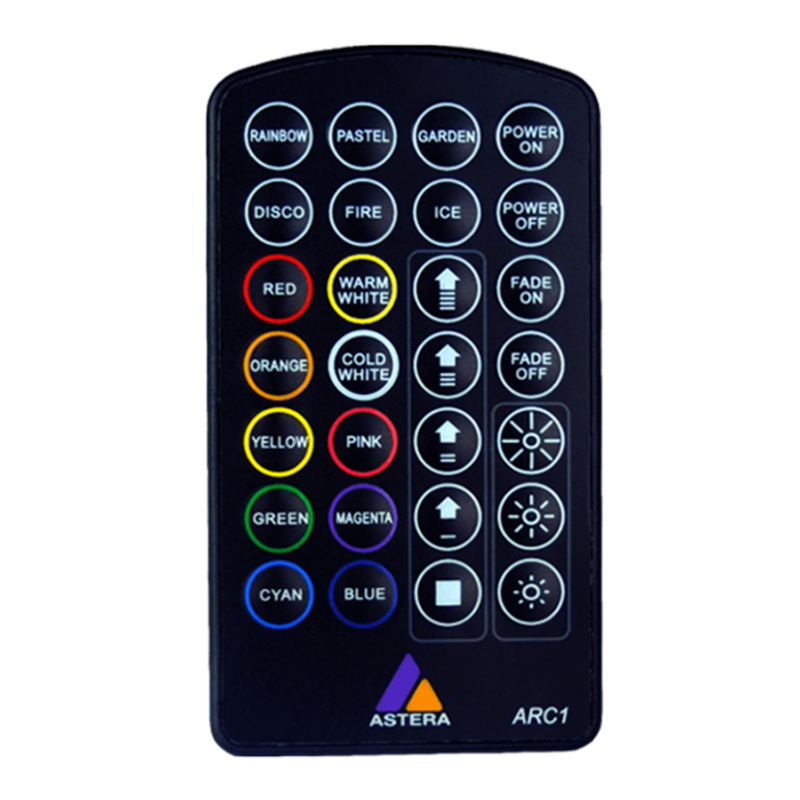 The Astera IR remote enables you to turn lights on and off, select from 10 preset colours, trigger lighting effects, and set fixture run times (e.g., 5 h, 8 h, or 12 h). It also supports confirmation of app‑sent settings, helping speed up setup and grouping of fixtures with minimal interaction.